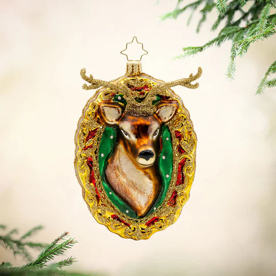 Oh, deer! This majestic buck is ready to take center stage on your mantel. With his shimmering antlers, golden frame, and lifelike details, he's sure to add a touch of woodland charm to your holiday decor.