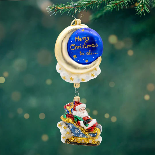 Hop on Santa's sleigh for a magical ride through the starry sky! This enchanting ornament features Santa soaring through the night, delivering presents to children around the world. With his shimmering moon, twinkling stars, and festive sleigh, this piece is sure to bring a touch of wonder to your Christmas tree.
