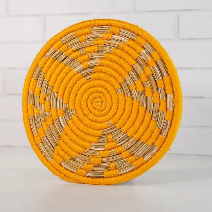 Our Moroccan Trivets feature typical designs originating in the Sahara Desert and created by Berbers. They are made with hand-woven palm leaves and decorated with wool using sustainable dyes. These hot dish serving pads are perfect for adding color to your table, especially when serving a traditional Moroccan Tagine! Our trivets are ethically sourced and handwoven and sewn by artisans in Marrakesh. They are woven in different areas but decorated by women in their homes while they look after their children. There are many colors used depending on what is available, but our set features Blue, Red, and Yellow. Add a touch of the exotic to your table or kitchen.