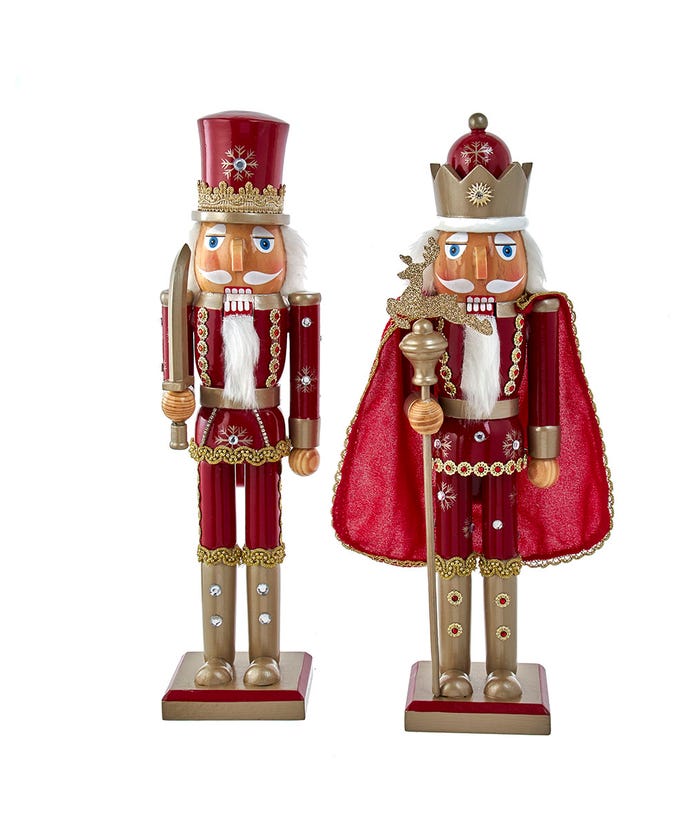 These regal red nutcrackers from Kurt Adler are an elegant addition to any home or office holiday décor. This assortment features a soldier dressed in regal red with gold accents with red and clear gemstones, he is holding a sword in his right hand and standing on a red and gold base. The King in this assortment is also dressed in regal red with a matching cape and gold accents with red and clear gemstones, he is holding a gold-glittered reindeer topped staff in his left hand and is standing on a red and gold base.