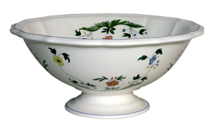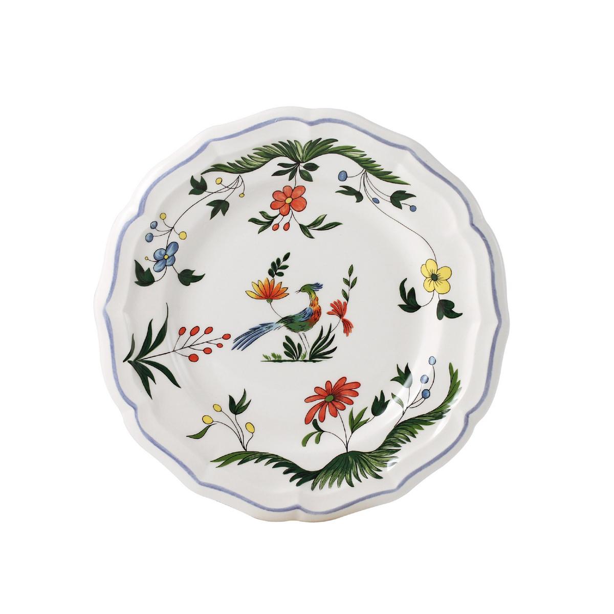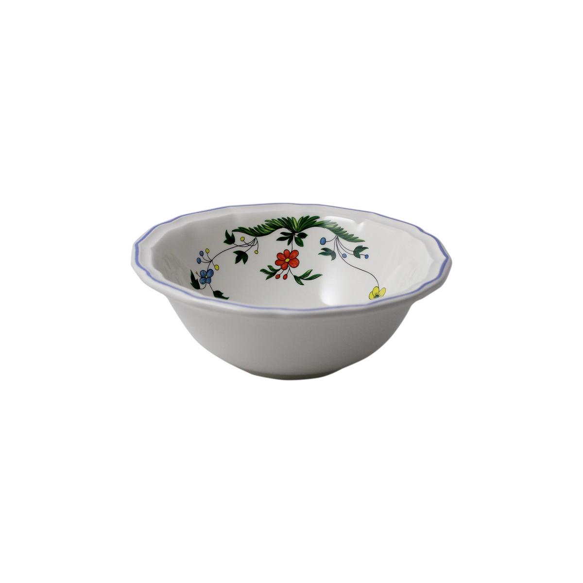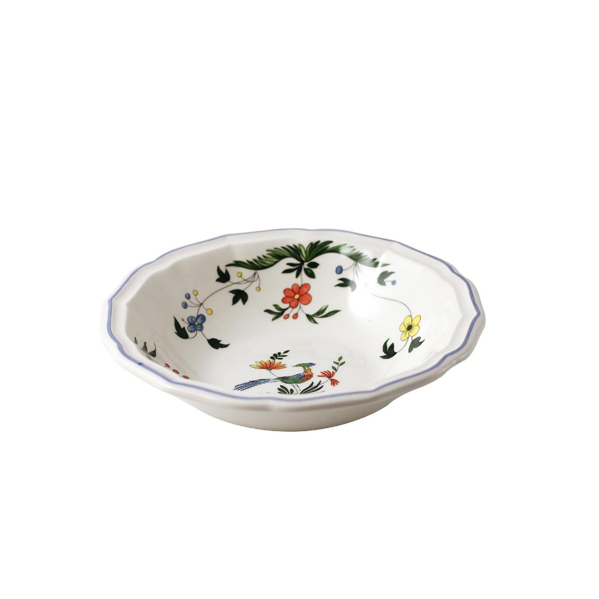 A singing bird evolves on a background of branches and geometric patterns. This soft blue design is enhanced with succulent fruits, cherries, figs, strawberries and blackberries, bringing a joyful burst of color.