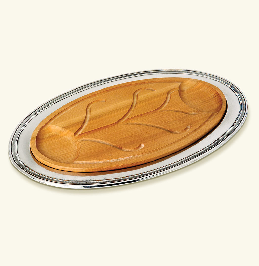 An eye-catching all-pewter oval serving tray perfectly scaled to hold anything from a large roasted turkey to small nibbles of sushi or petit fours. It features a removable cherry wood insert for carving.