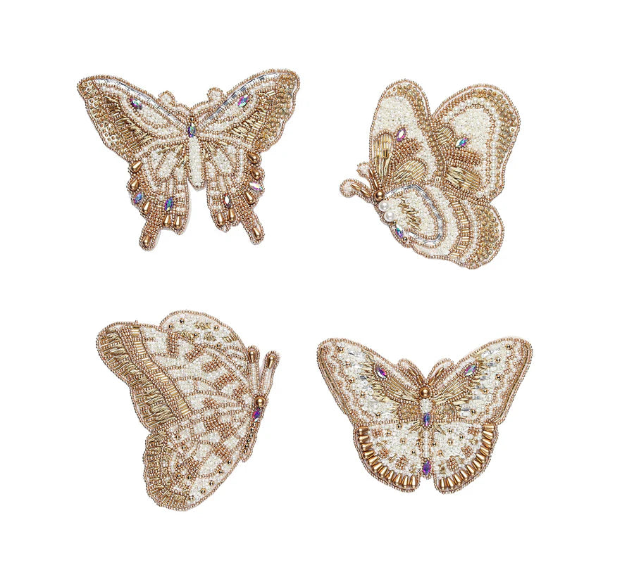 The Papillon coasters are a selection of four unique, exquisitely hand-beaded butterflies in white gold and silver tones. Fashioned with precision using glass beads and sequins, the three-dimensional hand-beading techniques bring lifelike textures to the wings. For a complete look, pair it with the coordinating beaded runner. The coasters are sold in a gift box as a set of four and would make for a lovely hostess gift.