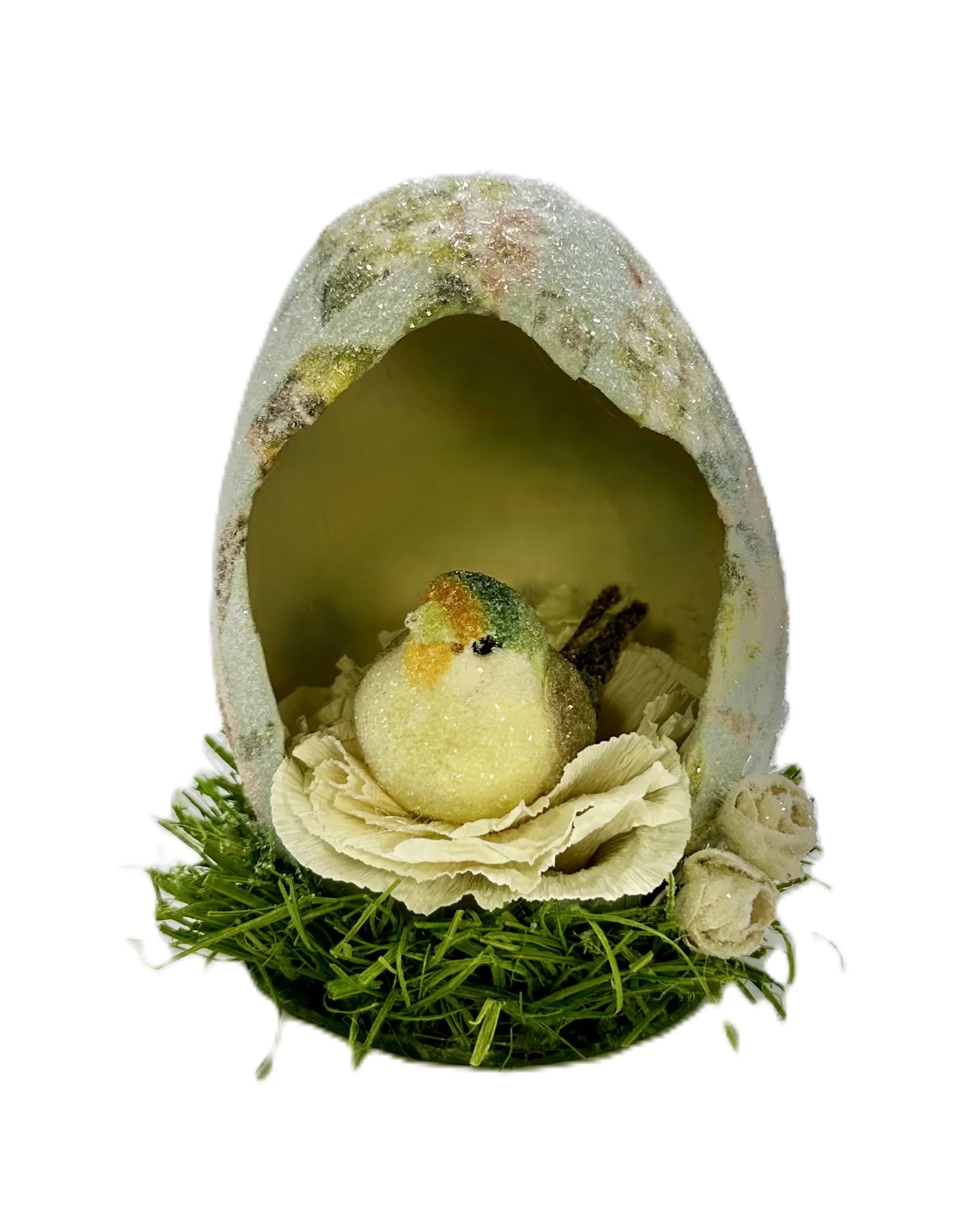A garden of charm in an egg! This dazzling decoupaged Flora Fauna peek-a-boo egg rests gracefully on ruffled cream crepe paper and a bed of green grass, topped with delicate little flowers. Inside, a glitter-kissed birdie or bunny waits to surprise and delight. A sparkly spring treasure that’s all about the details!