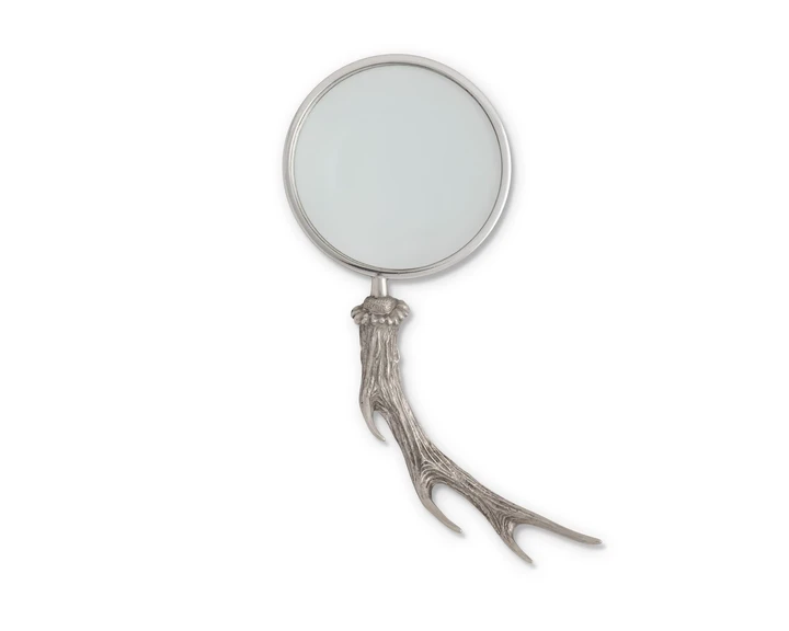 Celebrate the majestic spirit of the woodlands with this Vagabond House pewter antler magnifier. Its handcrafted grip brings to mind rugged hunting lodges and roaring fireplaces, and the curved shape fits comfortably in your hand. The antler's burr, main beam and points are intricately carved into the handle, creating a life-like piece that resonates with the lure of the open forest. Use this Vagabond House pewter antler magnifier to accent a study or library. The magnifying lens assists in reading the tiny print on small collectibles such as stamps and coins, and it can easily be carried from room to room. The entire piece measures 1 x 9 x 4 inches, and it creates an intriguing display on top of a table or a stack of books. This pewter antler magnifier will infuse your home with the spirit of the woodlands.