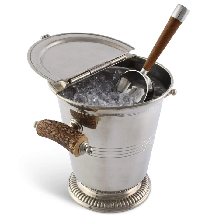 Recalling the fine pewter work of Sheffield in 18th Century England, our Vagabond House lidded ice bucket features hand-crafted natural-look faux antler handles with the exact look you will find in fine antique hollow ware made by the master crafters of the era