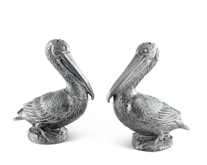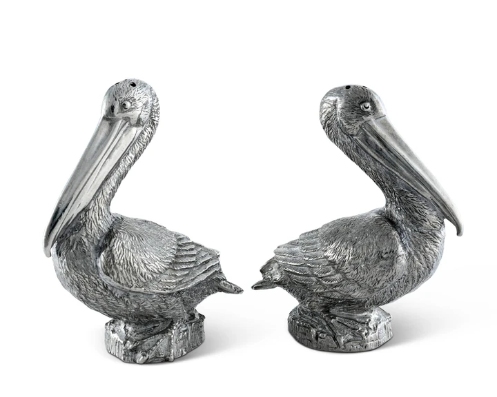 Inspired by a tale of a mother pelican wounding herself in a time of famine to feed her young with her blood, our designers created Vagabond House's Pelican Salt and Pepper Shakers with heartbreaking detail. Cast in pure pewter and hand finished, this unusual set will start conversations at the table as well as spice up your meal.