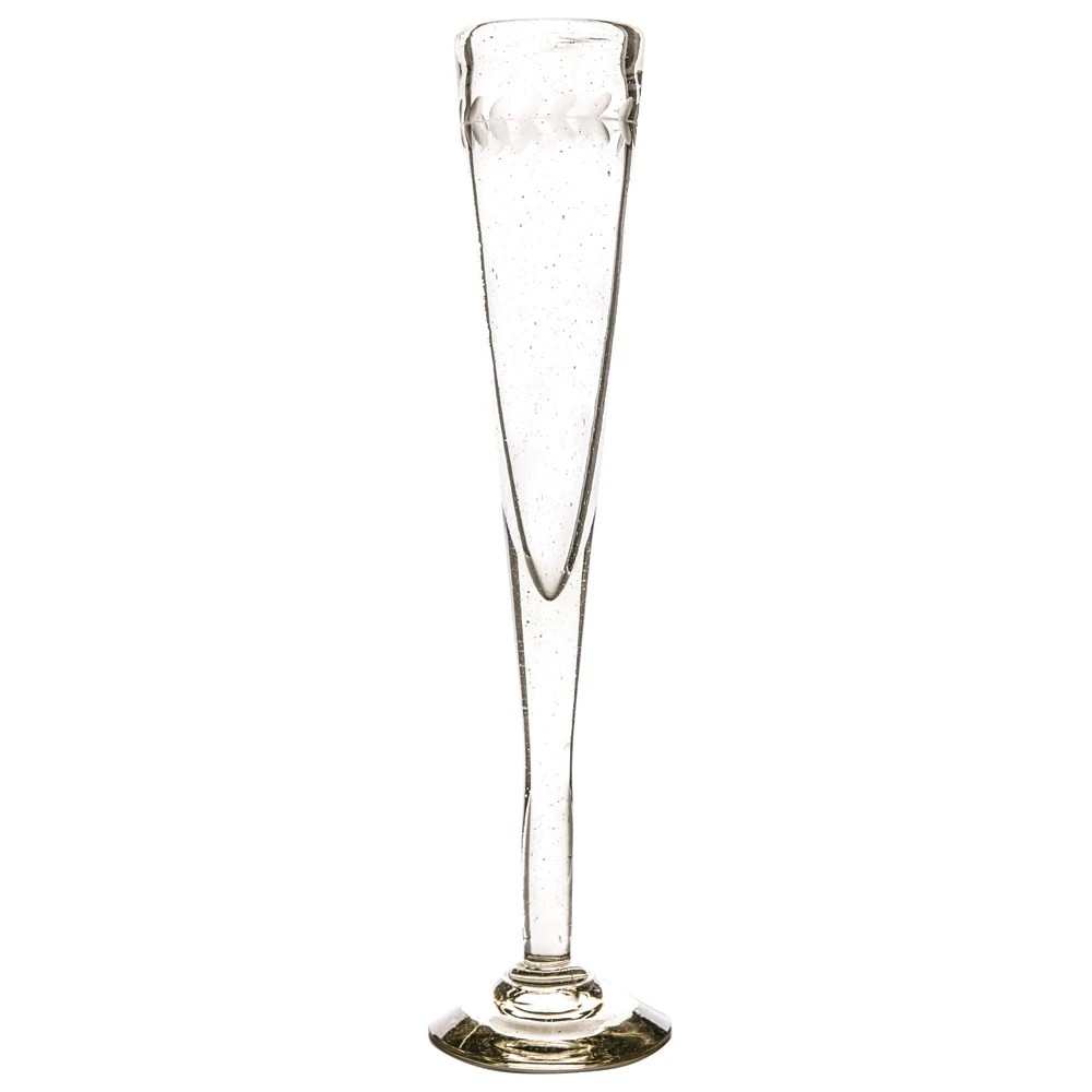 Pilar extremely tall champagne flutes with laurel engraving on clear mouth blown glass.