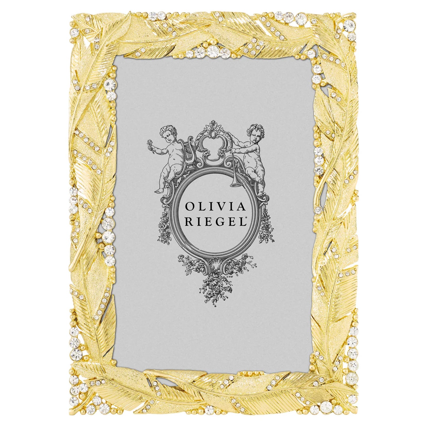 Enhance your space with the grace and beauty of regal plumage. Richly cast in gold or silver finished pewter and encrusted with hand-set clear pavé European crystals. Elegant champagne hued moiré silk back, with easel designed for vertical or horizontal placement. Tarnish resistant. Signature luxury gift box included.