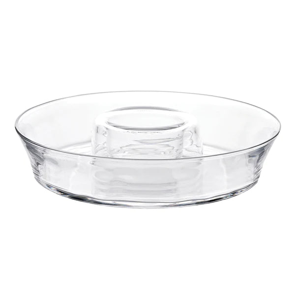 Keep it chic with this chip and dip server that elevates the humble to something a bit more special. Simple, textural lines in handsome mouth-blown glass, this piece allows you to easily present your favorite chips and dips with a splash of elegance.
