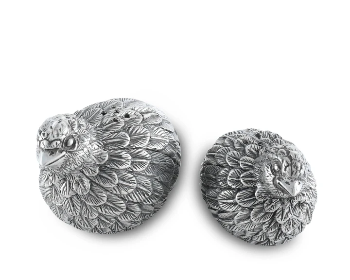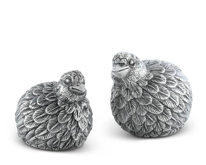 Vagabond Houses Pewter Quail Salt and Pepper Set is a pair of tiny quail statues. This lovely, loving quail couple tilt their heads towards each other as if conversing about things only quail could know. Intricately detailed feathers and life like posing are the hallmarks of Vagabond House master pewter smiths. Replaceable plastic plugs fit snugly into the fill holes on the bottom of each piece.