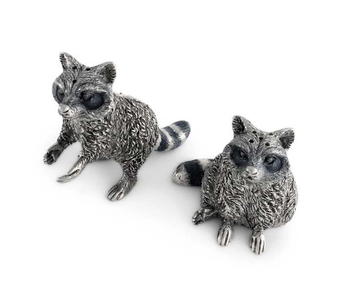 Cute and Clever, an adorable duo of raccoons captured in luxury pewter with fabulous, intricate detail are currently making mischief as Vagabond Houses Raccoon Salt and Pepper Set. A wonderful whimsical addition to any table top, the realistic detailing on these collectible critters includes their bandit masks, ringed tails and fuzzy fur. The detailing stands out from a masterful light antiquing of the pewter. The duo is must-have gift for shaker set collectors, animal adorers and nature lovers. The set has replaceable plastic plugs for easy filling.