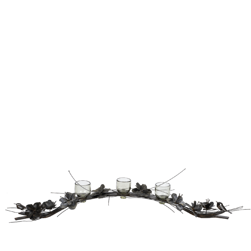 A romantic arc of roses and birds suspending three mouth blown vessels . . . a union, a celebration, a call for spring . . .