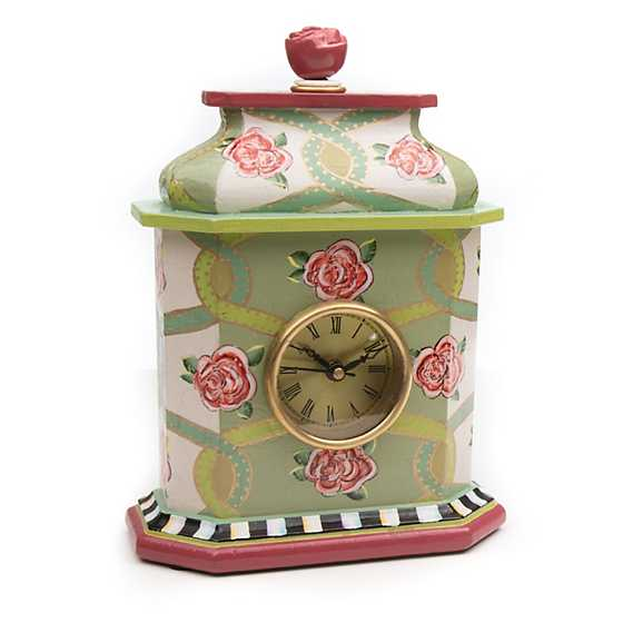 Make time for sophisticated style. The Really Rosy Desk Clock is crafted of sturdy yet stylish wood, hand-painted with our Roses and Ribbon pattern, trimmed with stripes on the edges and a faux rose finial on top.