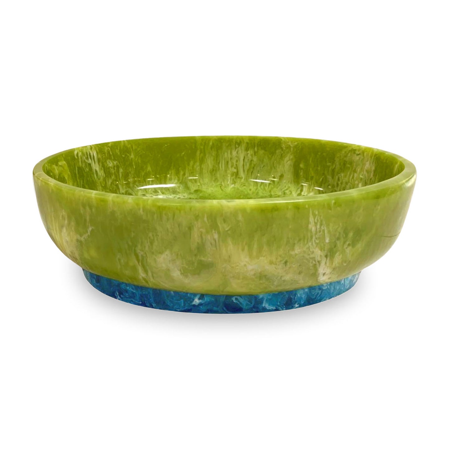 By popular demand! New Rio resin offerings from Beatriz Ball add boldly colorful designs that bring life to your table. Beatriz Ball introduces large and small round bowls with contrasting bases, plus large oval bowls also with contrasting bases all in colorful translucent resin. The RESIN Rio Large Oval Bowl with Base (White and Green) is perfect for serving or display. Pair with any other Rio design for an awesome set. Makes a great gift. Rounding out the new resin offerings are salad servers with vibrant “bubble” handles, and tines and spoons resembling natural horn. Five color combinations available. Each resin piece is unique with its own swirled color pattern, adding one-of-a-kind artistry to your table setting. BPA free. Hand wash only.