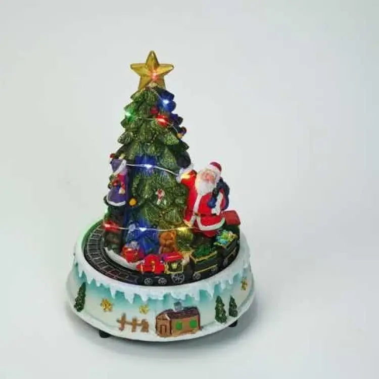 Santa and train. The train turns around the illuminated Christmas tree while a medley of 8 different Christmas melodies will play. Batterie operated. Height 8.6". NOT suitable for continuous operation.