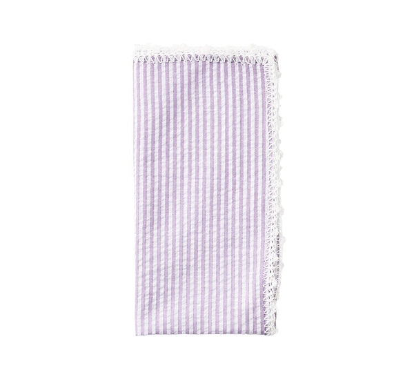 Created by a slack-tension weave technique, this cloth Seersucker Napkin is made of 100% cotton and has a natural puckered look, which allows for easy care. Its border is hand-crocheted with a bright edge, adding a nice jolt of color to the cloth napkin. This is a best-selling style and is available in various color combinations to complement different dining moods.