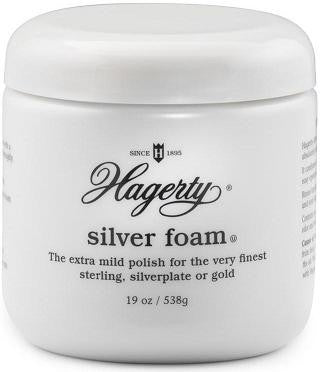 Hagerty Silver Foam makes cleaning and polishing sterling silver, silver plate, and gold easy with our simple wash, rinse and dry method. Powerful foaming action lifts away residue, removes light tarnish, and maintains patina on any item from jewelry to flatware. Developed in 1895 by our founder, William J. Hagerty, this mild polish has been trusted to care for silver treasures and heirlooms for more than 120 years.
