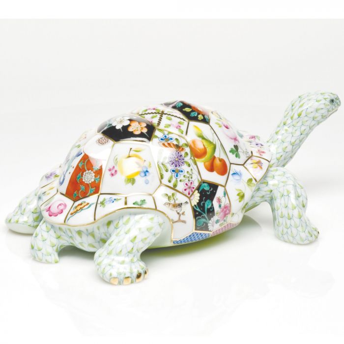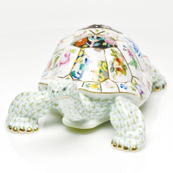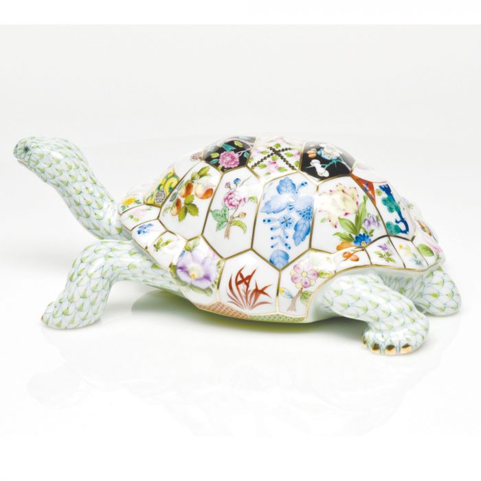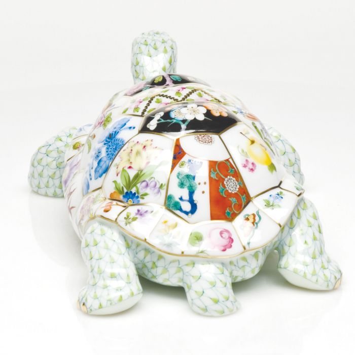 As much as the strength of porcelain is celebrated, the wrong trajectory as a piece falls out of an artist's hand can still yield broken shards. A natural hazard of life at the Herend manufactory has consequently inspired the dramatic Tesserae Tortoise. Taking its name from the small pieces of stone, glass or ceramic used in mosaics, thirty-eight different Herend patterns create a mosaic-like composition on the tortoise's shell. A crossroads of east meets west and past & present: four chinoiserie patterns anchor the center stripe of the turtle's back while flanking the center tile featuring the S vres Petites Roses pattern which takes inspiration from French artistry. A medley of fruits and flowers dances around the rest of the shell. The tortoise himself is painted in the new, complementary key lime fishnet which draws out the subtle nuances of the many greens. It takes 5 different Herend artists a combined total of 19 hours to paint the entire figurine.