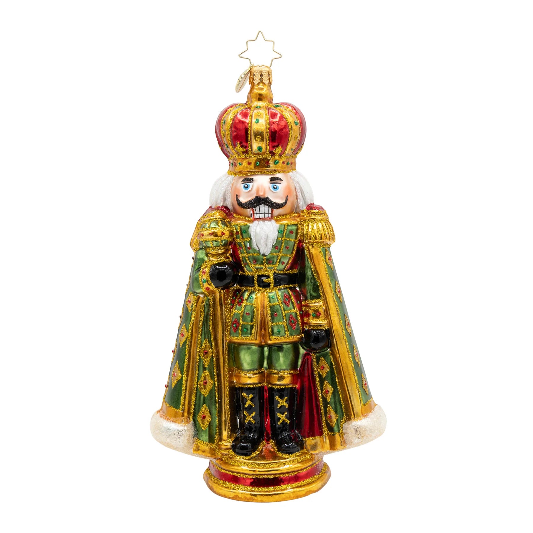 Standing tall in crimson, emerald, and radiant gold, The Gilded Sentinel is the timeless guardian of holiday cheer. With a jewel-studded crown, velvet-draped cape, and gleaming scepter, this noble nutcracker watches over the season with stately grace. A symbol of classic Christmas honor—ready to guard the magic of the season.