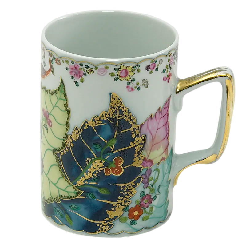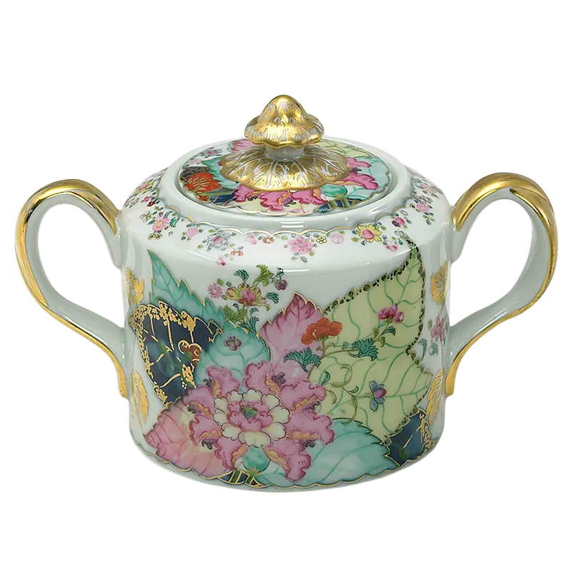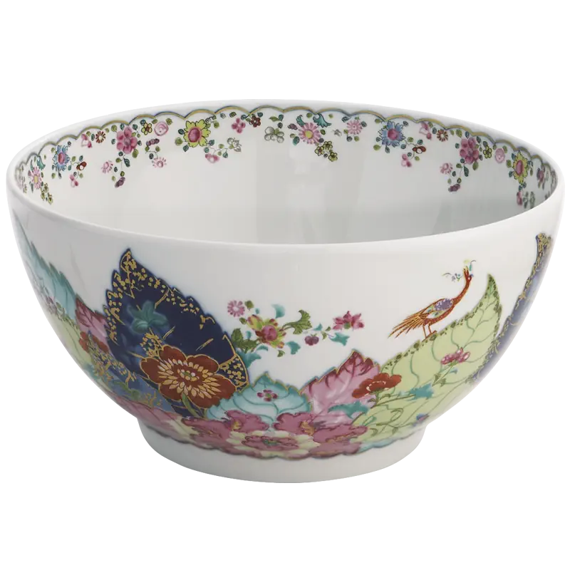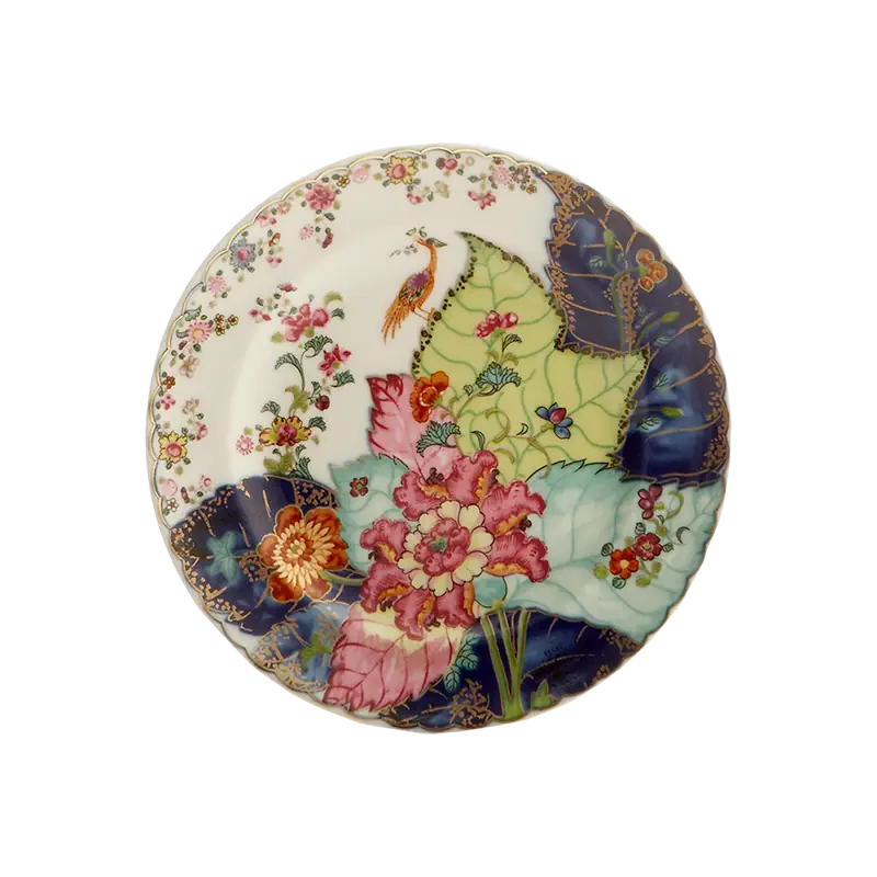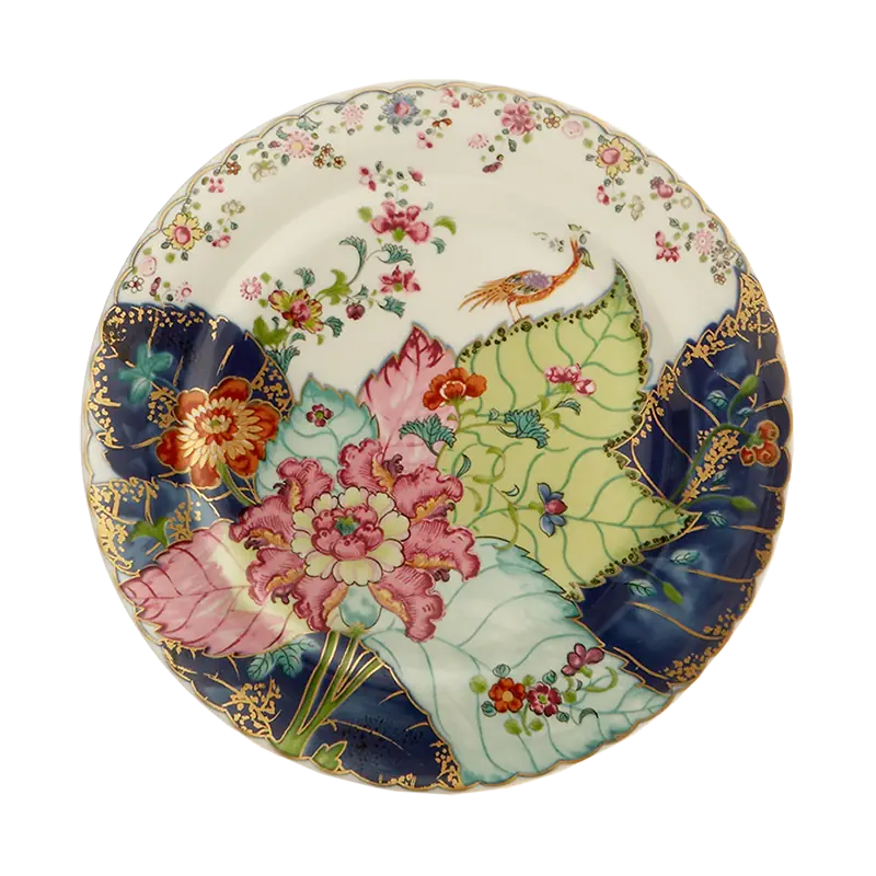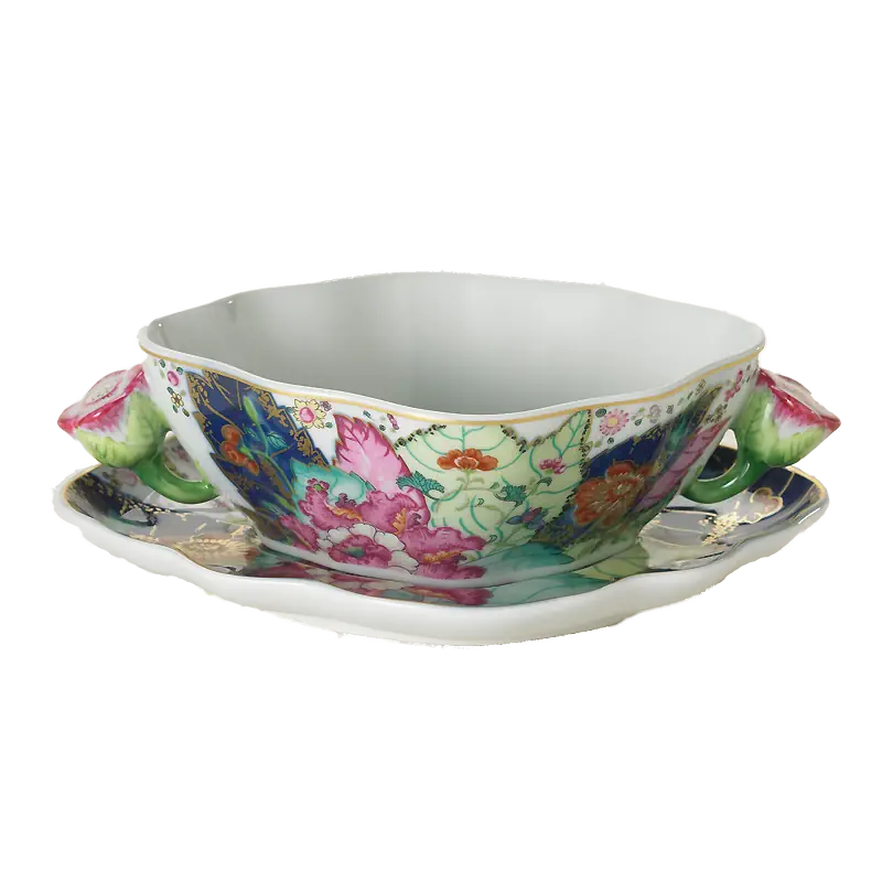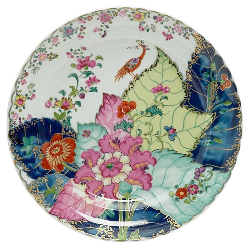 This extravagant design was originally made in China, probably for export to the Portuguese and Brazilian markets. Of all the 18th century dinner patterns, this was the most highly prized. A small phoenix bird perches on the leaves of the flowering Nicotiana (Tobacco) plant. Twenty-seven colors and 22k gold make up this pattern based on an original in the Metropolitan Museum of Art. This pattern, one of the longest running patterns by Mottahedeh, continues its strong popularity today, showing that good design is timeless.