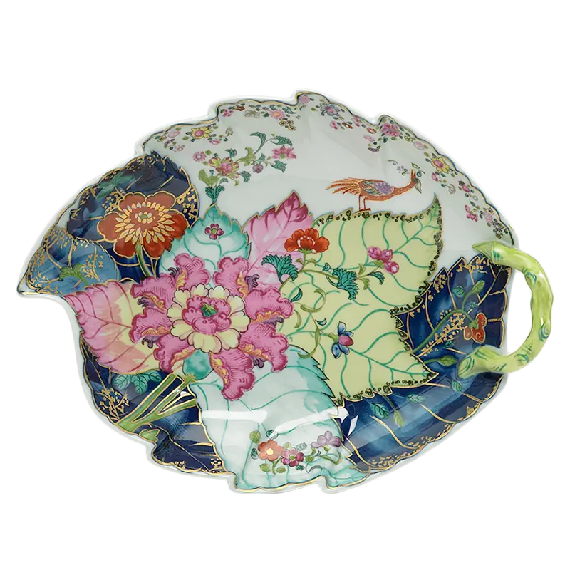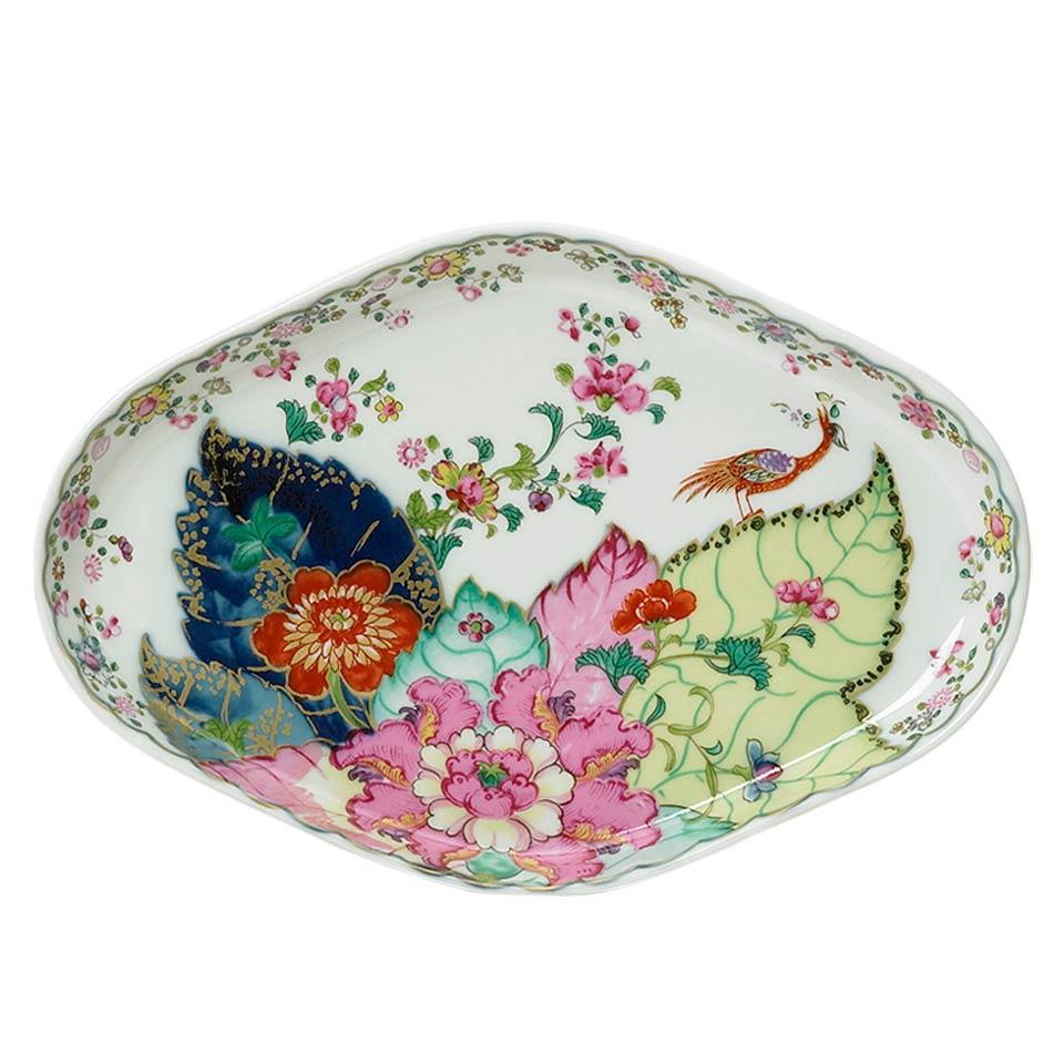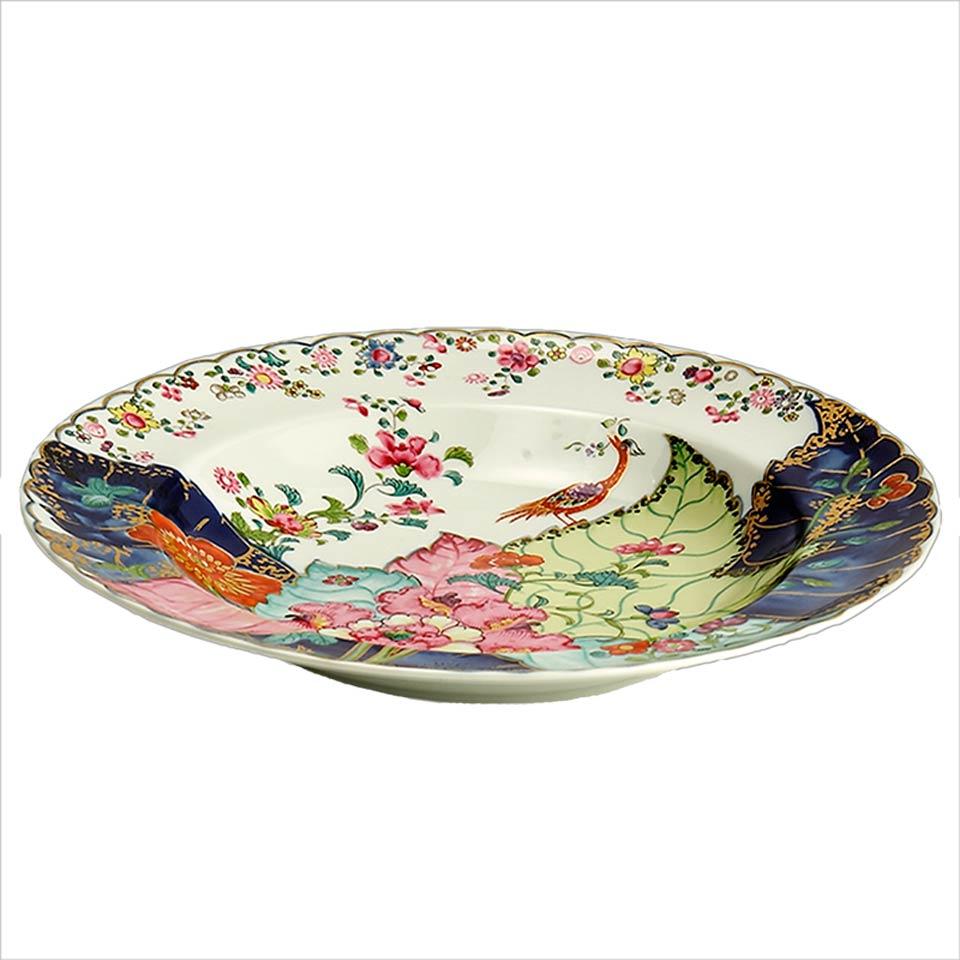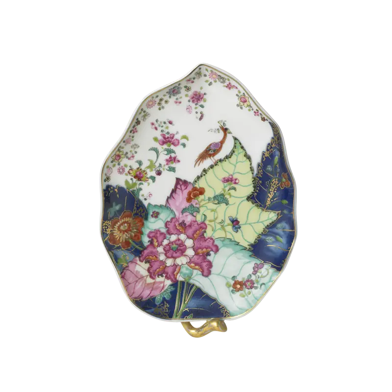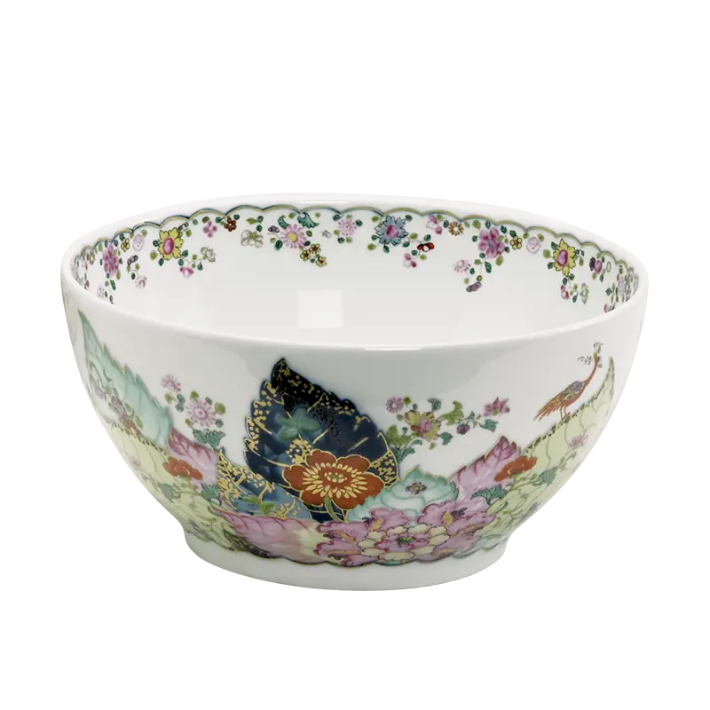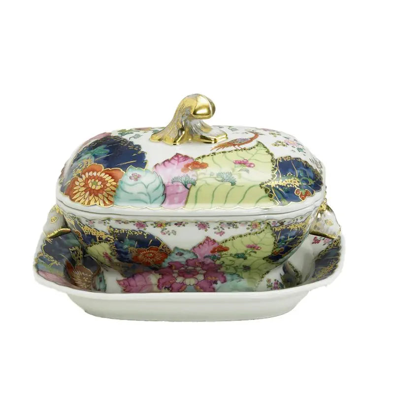 This extravagant design was originally made in China, probably for export to the Portuguese and Brazilian markets. Of all the 18th century dinner patterns, this was the most highly prized. A small phoenix bird perches on the leaves of the flowering Nicotiana (Tobacco) plant. Twenty-seven colors and 22k gold make up this pattern based on an original in the Metropolitan Museum of Art. This pattern, one of the longest running patterns by Mottahedeh, continues its strong popularity today, showing that good design is timeless.