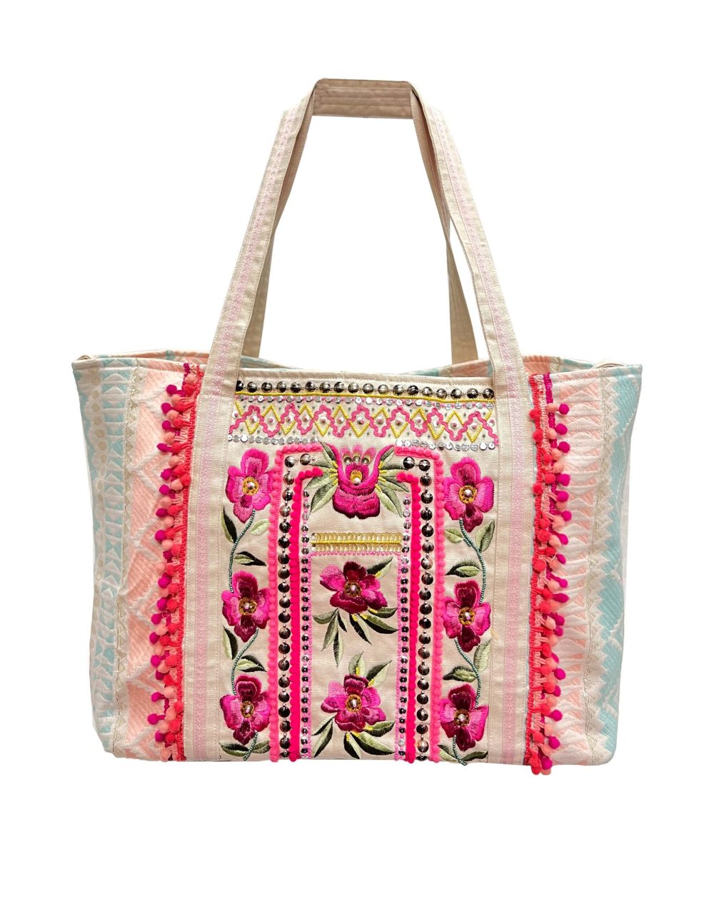 The delicate pink beading adds texture and elegance, while the symmetrical geometric patterns frame the central floral design, enhancing the bag’s artisanal appeal. This beaded tote bag combines functionality with a bold style statement, making it a unique and stylish accessory.
