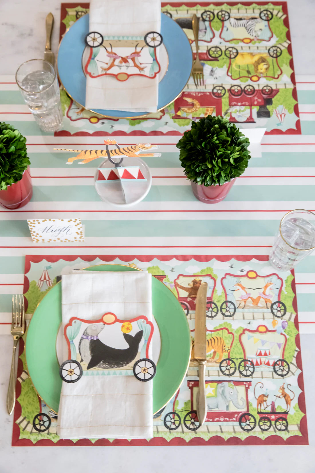 Created in collaboration with artist Elizabeth Foster, this traveling circus placemats will add a fun and whimsy to your table setting. Placemats come in pads, include 24 sheets and measure approx. 18.5" x 12.5". Designed and printed in the USA.