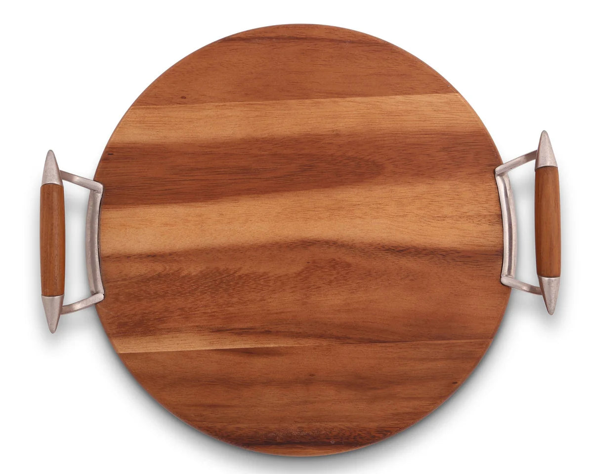 Vagabond House's classic round cheese board meets Mid-Century Modern style when crafted in hard-working, beautifully colored teak. A pair of comfortable round teak handles are fitted with pewter for a high fashion style and easy service.