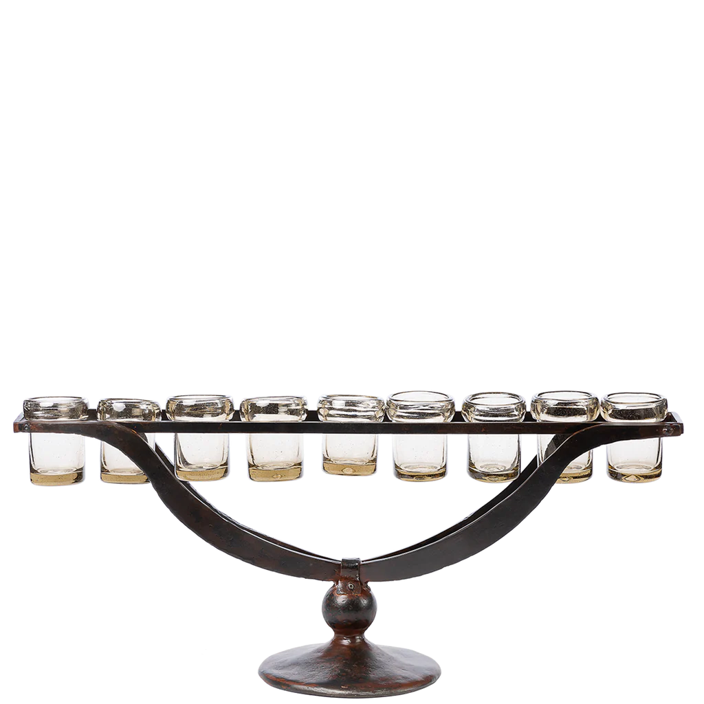 A line of light supported by gracefully forged outstretched arms, criss-crossing and coming to point atop a solid iron balin . . . elegance from all angles . . .