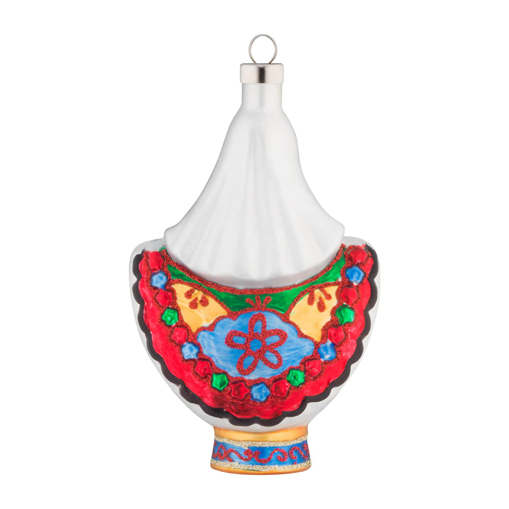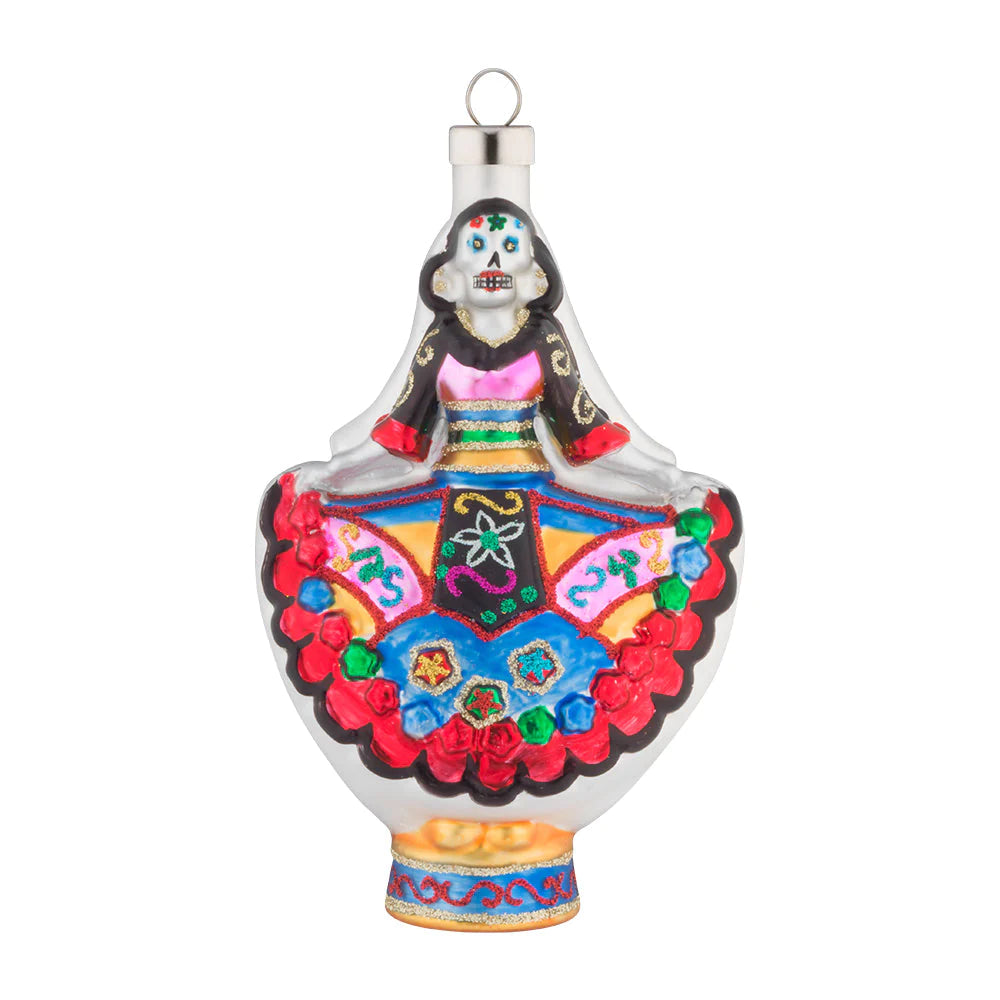 This glass skeleton is holding out her colorful skirt and will be sure to add a spooky touch to your tree this year.