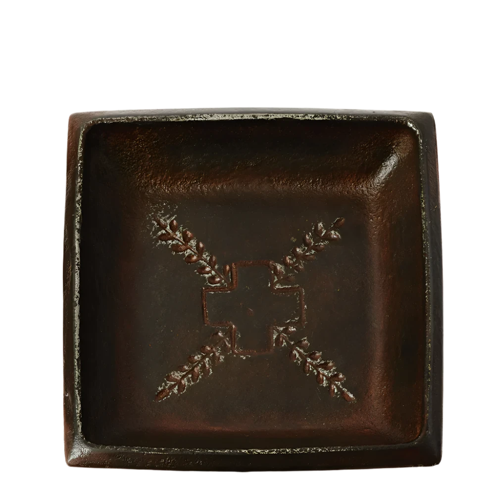 Cool and leathery wax cast valet tray with embossed cross and laurel