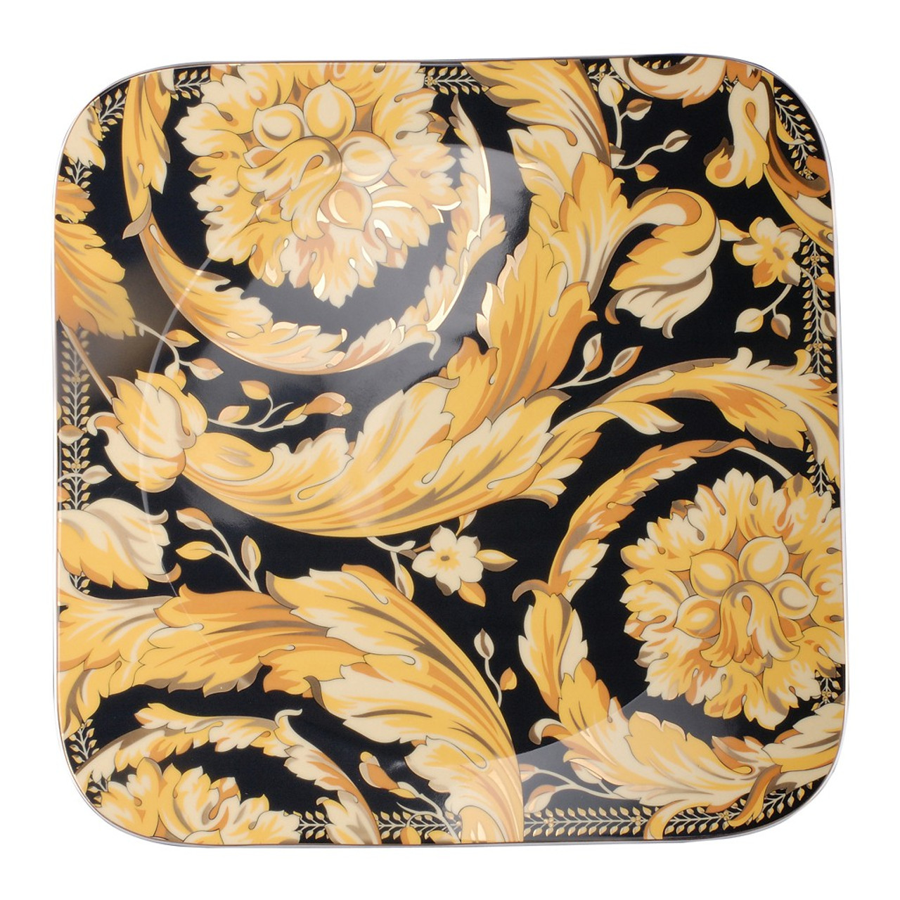 This beautiful Versace dinnerware is called Vanity. It is produced using the finest porcelain creating a style that is best described as luxurious and glamorous. The service plate measures 13 inch. The most prominent color of this item is gold. Playful floral decorations make this piece an eye catcher on every table or countertop.