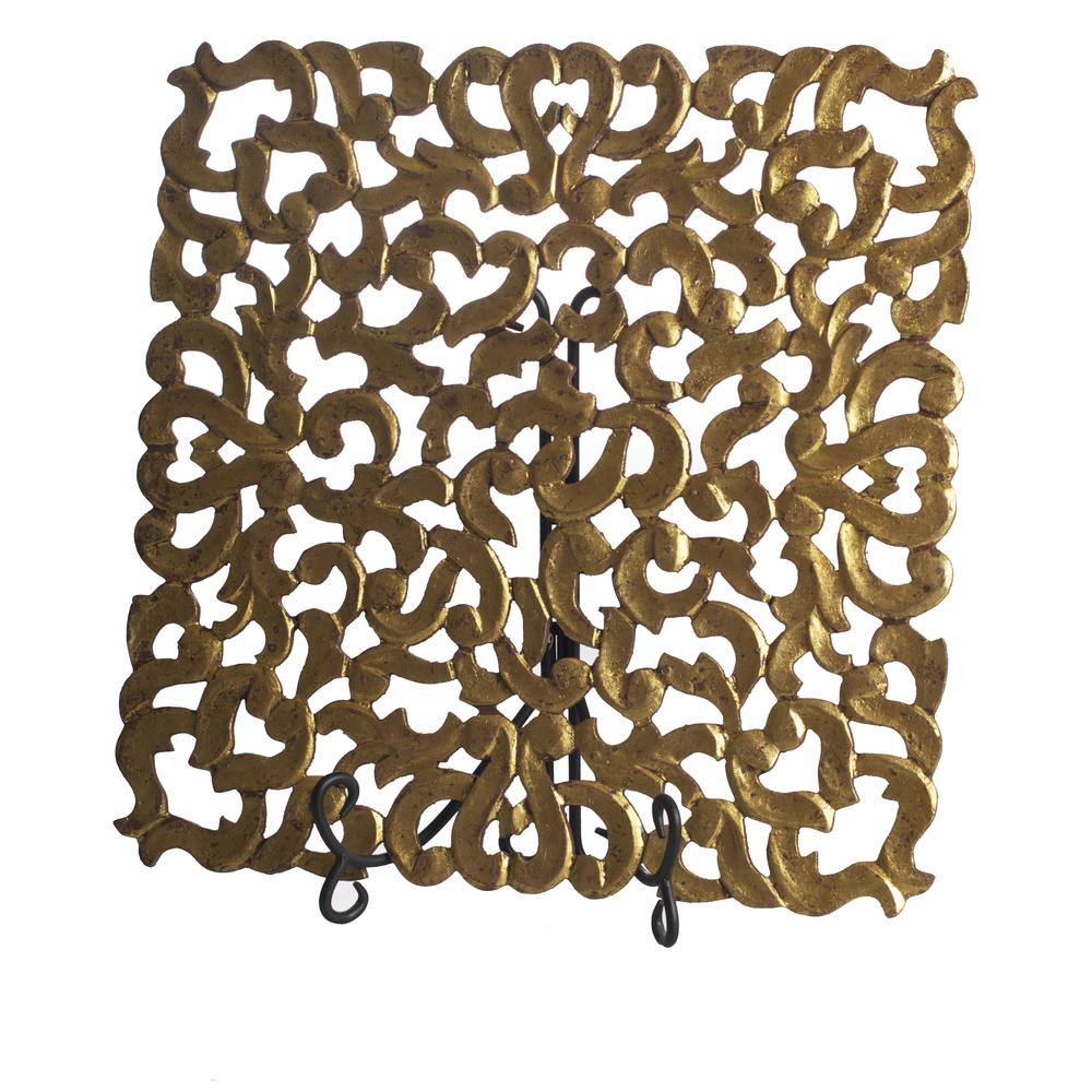 An interesting cut out design defines this gold leaf placemat. A light brushing of umber mellows the finish.