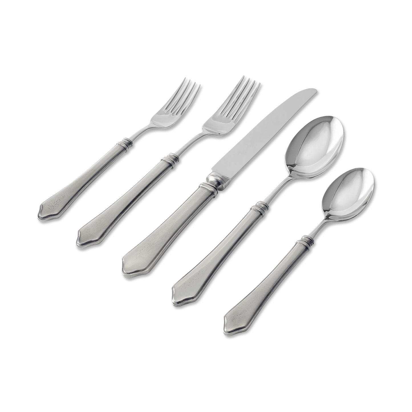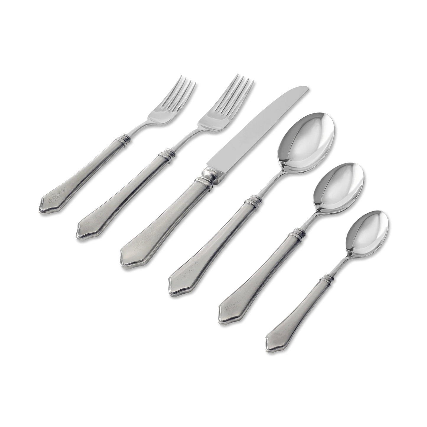 The Violetta flatware pattern is the tapered cousin of our best-selling Gabriella, and inherited her distinctive architectural details including the thumbnail edge and rounded banded collar. This handsome place setting of pewter and stainless steel tapers upwards from a triangular pewter handle base, joining with the stainless steel working ends.