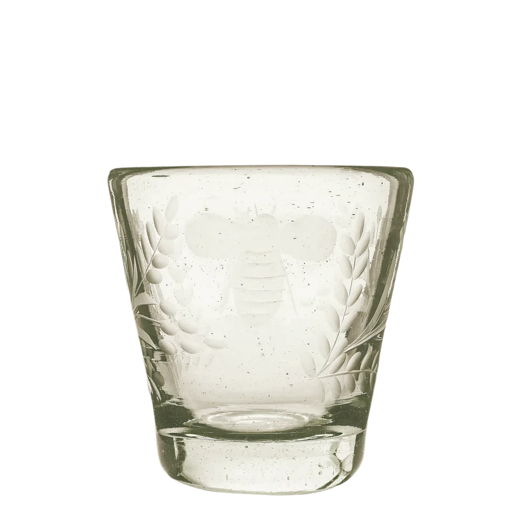 Mouth blown glass DOF with wee-bee engraving.