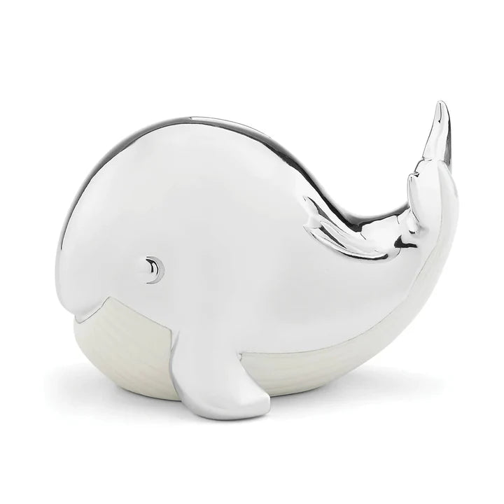 Part of the Mystic Sea Collection and made of porcelain with a shiny silver finish, this coin bank is cast in the shape of a smiling whale. Ideal for a birthday gift, the whale looks charming on a bedside table or child's dresser.