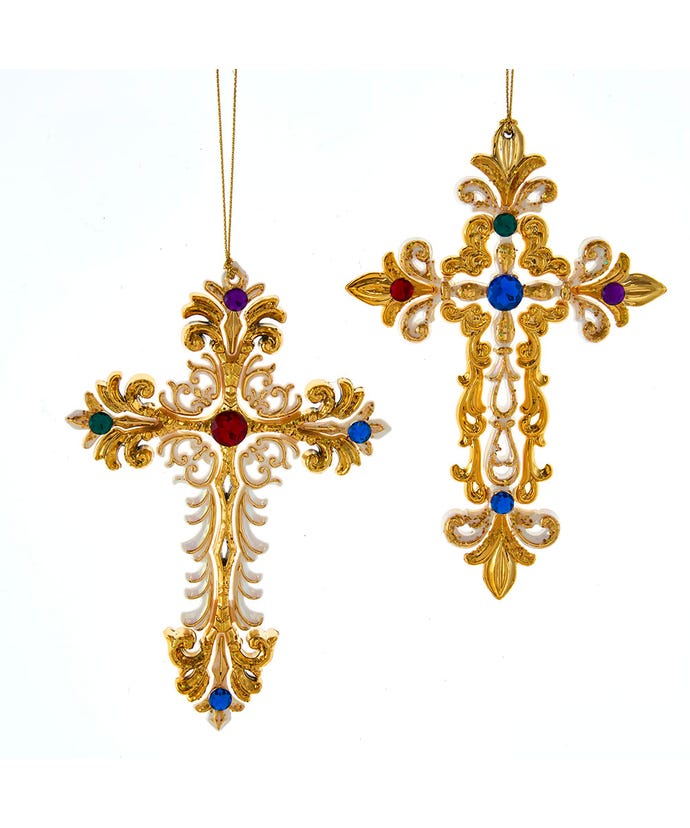 Kurt Adler's white and gold cross ornaments are a stunning addition to any holiday décor or Christmas tree. This assortment features two white and gold cross ornaments, each with a unique design. Each cross ornament is embellished with multicolor gemstones.