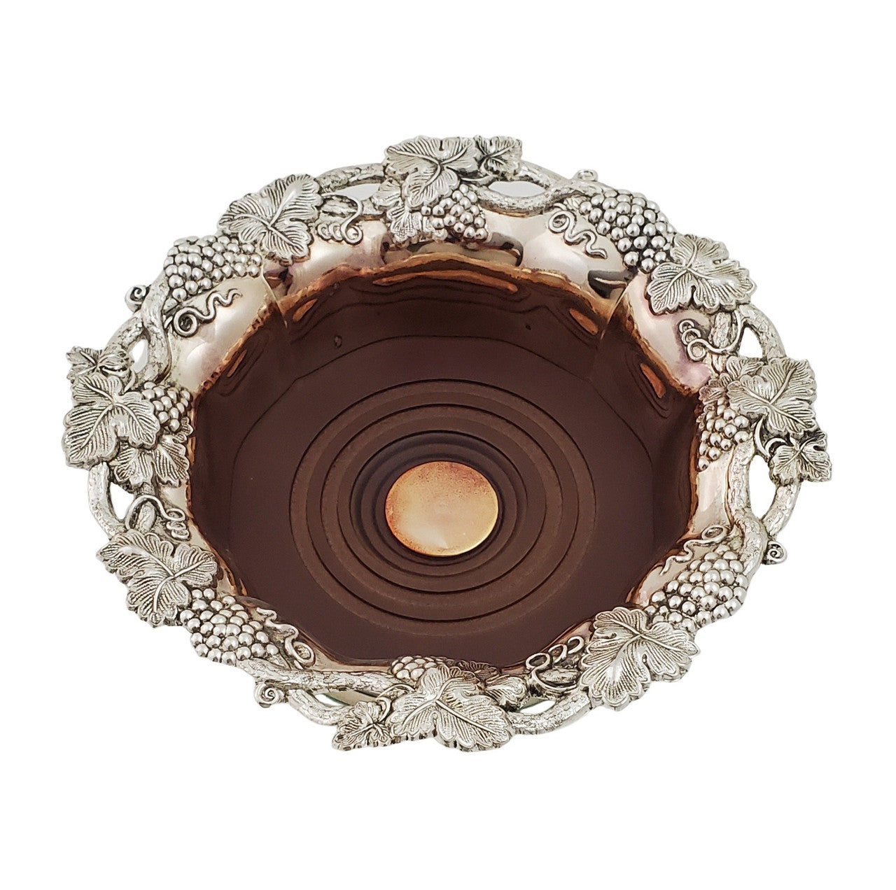 Vintage Style Silver Plate Wine Coaster Dimensions: 7" wide, 5" interior, 2" high Presentation: Comes in a blue presentation box, perfect for gifting Material: Silver plate with a faux wood base Protection: Green felt underside to prevent scratching Maintenance: Wipe only, no polishing required Customization: Engravable large silver disc in the center This elegant wine coaster features intricate grapevine patterns along the rim, adding a touch of vintage charm. Ideal for both use and display, it combines functionality with aesthetic appeal.