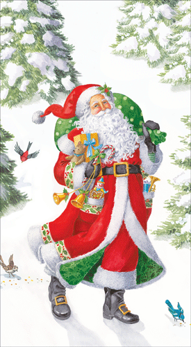 In this Design: Ingrid Slyder's smiling Santa strolls through a snowy forest landscape with is sack of gifts.